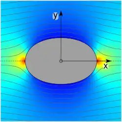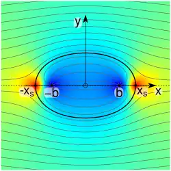 Der Imaginärteil des Geschwindigkeitspotentials ist die Stromfunktion, deren Höhenlinien Stromlinien sind, die in einer stationären Strömung wie hier mit den Bahnlinien übereinstimmen. Es tritt an keiner Stelle der Stromlinie Fluid über sie hinweg: Stromlinien können hier als undurchdringliche Wände aufgefasst werden.[2] Dies gilt insbesondere für die Staupunktsstromlinie, die vor und hinter dem Oval auf der x-Achse verläuft und dazwischen der Kontur des Ovals folgt.