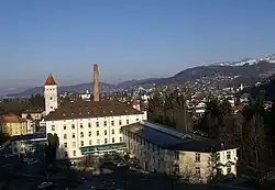 - Spinnerei Rhomberg: Diese Anlage wurde 1839 von Ohmaier erbaut und ist mit wenigen Zubauten in zwei Bauphasen entstanden. Das Gebäude gehört zu den ältesten Spinnereibauten des Landes. Durch die Lage zwischen Wasser und Straße waren keine Ausdehnungsmöglichkeiten vorhanden, sodass notgedrungen ein kompaktes Objekt entstand, das mit der Topographie wie verwachsen scheint. Die ruhigen Volumen, Fensterfronten und nicht zuletzt der gut aufgesetzte Wasserturm ergaben einen seltenen Industriebau.