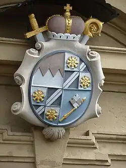 Blasonierung: „Gespalten; vorne in Silber ein durchgehendes schwarzes Balkenkreuz, hinten mit vier Spitzen gespalten von Rot und Silber.“[6] |
