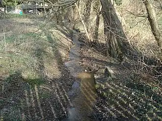 Der Bach verläuft zunächst in östliche Richtung durch den Waldstreifen und ist dann im Ort komplett verrohrt.