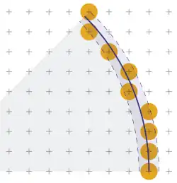 Ein Algorithmus, der nur Additionen und Subtraktionen verwendet, wurde 1976 von Horn vorgestellt.[2] Bei Horns Verfahren befinden sich die einzufärbenden Pixel innerhalb eines ein Pixel breiten Bereichs um den idealen Kreisbogen. Wenn das aktuelle Pixel ist, dann wird die Position des direkt darüberliegenden Pixels mit dem rechten Rand dieses Bereichs verglichen. Liegt es innerhalb des Bereichs, wird dieses Pixel gewählt. Liegt das Pixel außerhalb, so wird das links liegende Pixel gewählt. Auf letzteren Fall lässt sich unter Einführung der Kontrollvariable folgendermaßen testen: