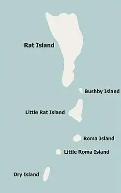 Die keilförmige und durchweg flache Insel ist von einem dichten Korallenriff umgeben, das auch die südlich angrenzenden Nachbarinseln Bushby Island, Little Rat Island, Roma Island, Little Roma Island und Dry Island einschließt. Rat Island ist über die Good Friday Bay („Karfreitagsbucht“) im Norden zu erreichen. Die Good Friday Bay bietet einen sicheren Ankerplatz. An der Nordostseite befindet sich ein Anlegesteg.[1]
