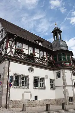 Das heutige Rathaus in Fachwerkbauweise wurde 1579 auf den Grundmauern eines Vorgängerbaus errichtet. Es wurde als Repräsentationsbau von keinem anderen Gebäude der Stadt übertroffen. Im 19. und 20. Jahrhundert fanden umfangreiche Renovierungsarbeiten am Gebäude statt. Die Kaufhalle der Metzger und Bäcker im Untergeschoss, durch zwei rundbogige Tore zu erreichen, wurde dabei mit Wänden verbaut.