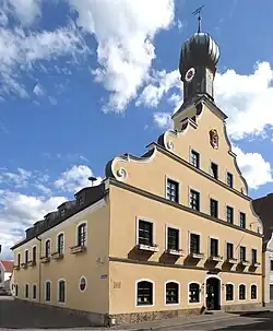 Der breite zweigeschossige Giebelbau mit Satteldach und sechs zu sieben Fensterachsen wird von einem massiven Dachreiter mit Zwiebelhaube und Uhr bekrönt. Im Giebel ist das Wappen der Stadt, ein aufsteigender schwarzer Bär, als Relief angebracht.
