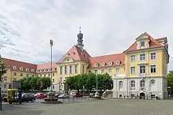Der dreigeschossige neobarocke Bau besteht aus einem 87 m langen und 30 m hohen Hauptflügel und je einem 48 m langen und 23 m hohen Seitenflügel an der Ost- und Westseite mit unterschiedlichen Grundrissen. Der mittlere Teil des Hauptflügels ist turmartig aufgeweitet, übersteigt das übrige Gebäude jedoch nur um ein Dachgeschoss und einen Dachreiter. Bis zur Spitze des Dachreiters sind es 40 m.[1]