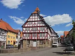 Der dreigeschossige Rähmbau auf zum Teil verputztem Erdgeschoss in Bruchsteinmauerwerk ist mit rechteckigen Zwillingsfenstern mit gekehlter Laibung versehen. Die Obergeschosse bestehen aus kräftigem Fachwerk mit Streben an Bund- und Eckpfosten. Auf dem Krüppelwalmdach sitzt ein achteckiger Dachreiter. Die Geschossüberhänge werden von profilierten Balkenköpfen, Füllhölzern und Rähm- bzw. Schwellbalken mit Ornamenten gebildet.