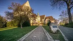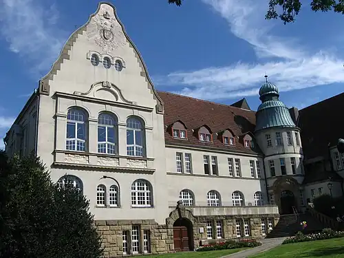 Der Entwurf des Verwaltungsgebäudes wurde in einem Architekturwettbewerb unter 89 Vorschlägen ausgewählt. Der Bau wurde in den Jahren 1907 und 1908 unter Leitung des Architekten Otto Mecke aus Metz errichtet. Die Grundsteinlegung fand am 3. Juli 1907 statt[2]. Am 1. Oktober 1908 wurde das neue Krayer Rathaus an der Osterfeldstraße, die heute den Namen Kamblickweg trägt, unter Bürgermeister Ludwig Kohlen und den Beigeordneten August Schulte-Ising und Wilhelm Beckmann eröffnet.