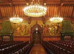 In den Jahren 1860/61 wurde das Rathaus von Leonhard Schmidtner nach dem Vorbild des Frankfurter Römers in die heutige Form gebracht. Von 1876 bis 1880 besorgte Georg von Hauberrisser den neugotischen Rathausprunksaal. 1880 bis 1882 kamen die Wandgemälde dazu, die darauf zurückgehen, dass bei der Landshuter Fürstenhochzeit ein Teil des Baus als Tanzsaal hergerichtet worden war und hier der Tanz der Brautleute stattfand. Die Gemälde der in München ansässigen Maler Ludwig von Löfftz, Rudolf Seitz, August Spieß (1841–1923) und Konrad Weigand (1842–1897) zeigen eine historisierende Darstellung des spätmittelalterlichen Hochzeitszuges des Jahres 1475.[1] Das Landshuter Motiv der Anordnung von portalflankierenden neogotischen Prunkkaminen, stadthistorischen Gemälden und geschnitzter Holzdecke mit Prunkleuchtern im Rathausfestsaal verwendete Architekt Hauberrisser wenige Jahre später bei der Ausgestaltung des neospätgotischen Festsaales des Rathauses St. Johann in ähnlicher Form wieder.