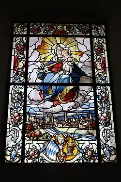 Über dem mittleren Fenster des ersten Obergeschosses befindet sich eine Kartusche mit dem Wappen der Stadt Lauingen. Als oberer Abschluss der Fassade dient ein Triglyphenfries und ein umlaufendes, an den Ecken und in der Mitte verkröpftes, profiliertes Traufgesims. Im Giebelfeld ist das kurbayerische Wappen zwischen einem Löwen und der Gestalt der Fama mit Trompete dargestellt.