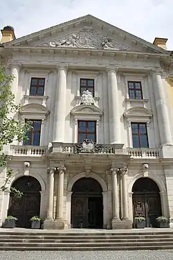 Vor dem Nordflügel mit dem Hauptportal befindet sich der Marktplatz. Die Schaufassade besitzt neun Achsen mit Architekturgliedern aus Kalkwerkstein. Das rustizierte Erdgeschoss mit Ecklisenen steht im Osten auf einem hohen Sockel. Die drei mittleren Achsen treten dreimal gestuft als Risalit unter einem Dreiecksgiebel hervor. Die Erdgeschossfenster mit profilierten Rahmen besitzen Sohlbänke auf Konsolen und schmucklose Schlusssteine. Die schmiedeeisernen Ziergitter sind wohl aus der Entstehungszeit. Über Treppenstufen erreicht man die drei Rundbogentore im Mittelrisalit. Das Mittelportal wird von Doppelsäulen auf Sockeln mit Basen und ionischen Kapitellen flankiert. Der Schlussstein ist mit einem Männerkopf mit Haube geschmückt. Am Architrav ist folgende Inschrift angebracht: „INCHOATA MDCCLXXXIII – ABSOLUTA MDCCXC“ (in der Mitte), „JOANNE GEORGIO LAVNER“ (über dem linken Säulenpaar) und „ARCHITECTO CIV.ET PROV.LAVING“ (rechts). Über dem Gebälk befindet sich ein Balkon mit Balustrade zwischen Eckpfeilern. Daran ist die folgende Inschrift angebracht: „DIRIGENTE D. FERD. DE SETZGER S.R.I. EQUITE CONSIL. AUL. ACT. MONACHII.“ (am linken Pfeiler), „ARCHITECTORE D. LAUR. DE QUAGLIO CONSIL. CAM. ET ARCHITECTORE AULICO. MONACHII“ (am rechten Pfeiler) und „SVRREXIT HAEC CVRIA IVSSV CAROLI THEODORI D.G.C.P.R.V.B.D.S.R.I.A. ET ELECT. D.I.C.M.“ (in der Mittelkartusche). Die Portale bestehen aus zweiflügeligen Türen mit Schnitzereien. Die Fenster des ersten Obergeschosses sind reich gerahmt und mit Dreiecksgiebeln geschmückt, die im zweiten Obergeschoss sind mit geohrtem Rahmen und geraden Gesimsen versehen. Der Mittelrisalit ist durch vier Dreiviertelsäulen gegliedert, die Gebäudekanten sind durch gestufte Pilaster eingefasst.