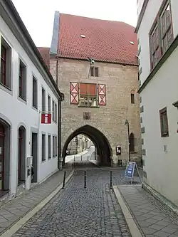 Das Rathaus in Mühlhausen/Thüringen liegt zwischen dem Unter- und Obermarkt, teilweise über dem Bachlauf der Schwemmnotte. Im Hof befinden sich noch Reste des mittelalterlichen Marstalls. Der älteste, gotische Teil des Rathauses ist am Spitzbogen über der Ratsstraße zu erkennen.
