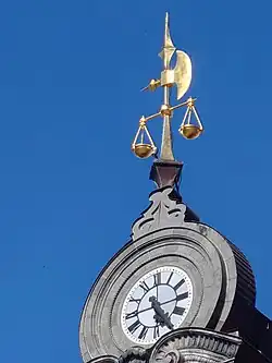 Der Hauptturm, in dem sich die Nische mit der Göttin befindet, trägt eine große runde Turmuhr und an der goldenen Turmspitze darüber sind die Utensilien der Gerechtigkeit – Schwert und Waage – angebracht.