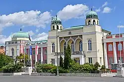 Das Rathaus wurde nach einem Entwurf von Aladár Árkay und dessen Sohn Bertalan, die auch die erst 1940 fertiggestellte Votivkirche in direkter Nachbarschaft des Rathauses entwarfen, zwischen 1924 und 1928 erbaut.[1] Es hat einen annähernd rechteckigen Umriss, der nur durch eine Aussparung an der südöstlichen Ecke durchbrochen ist. Durch diese kann der Innenhof des Rathauses erreicht werden. Der Baustil wird als „ungarisch“ umschrieben, enthält jedoch zahlreiche orientalisierende Elemente wie die Turmkuppeln an den Ecken des Gebäudes und über dem Haupteingang.