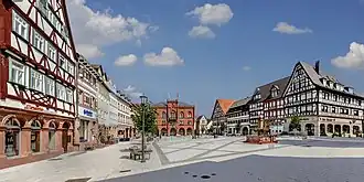Das Rathaus ist am Tauberbischofsheimer Marktplatz in ein Bauensemble von Fachwerkhäusern eingebettet.[9]