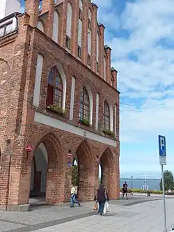 Der Bau von 1426 war ursprünglich auf fast quadratischem Grundriss errichtet. Später wurde der östliche Teil mit Laubengängen angebaut. Die mittelalterliche Gestalt des Baus hat sich trotz vieler Umbauten bis 1945 erhalten. Durch Kriegseinwirkung brannte der Bau 1945 aus und wurde, nach polnischer Übernahme der Stadt, in den 1960er Jahren rekonstruiert.