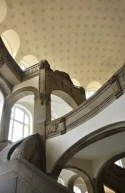 Das Haupttreppenhaus im narrativen Charakter entstand nach Entwürfen von Giesecke und Gotthold Riegelmann, das westliche Treppenhaus von Westphal. Das Haupttreppenhaus weitet sich in der ersten Etage zu einer großzügigen Halle. Frühere Bleifenster, die das Bildprogramm fortsetzten, sind nicht mehr erhalten.[9]