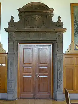 An der der Arkadenwand gegenüberliegenden Seite des Saales befindet sich in der Mitte ein prächtiges Neorenaissance-Portal aus Sandstein. In der Supraporte sind Symbole von Recht und Gerechtigkeit dargestellt (Waage, Richtschwert, Gesetzbuch). Links vom Türgewände hängt als Holzrelief das Dillinger Gemeindewappen, rechts vom Türgewände das Wappen der lothringischen Dynastie Lenoncourt, die von 1657 bis 1743 die Herren von Dillingen stellte und im Jahr 1685 die Dillinger Hütte gründete.