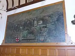- Links von der Eingangstür: „Das alte Schloss und die Dillinger Hütte im Jahre 1909“. Am unteren Bildrand des Gemäldes sind wiederum das Dillinger Gemeindewappen (rechts) und das Wappen der Dynastie Lenoncourt (links) dargestellt.