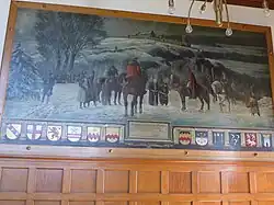 - Rechts von der Eingangstür: „Die Rückkehr der Herren von Siersberg und Dillingen von der Belehungsfeier in der Liebfrauenkirche zu Trier am 17. Januar 1333“[14] Zu sehen ist eine teilweise berittene Ritterschar am Fuße der Siersburg in einer verschneiten winterlichen Landschaft. Die dargestellte Szene erinnert an die heftigen Auseinandersetzungen im 13. und 14. Jahrhundert zwischen dem Erzbistum und Kurfürstentum Trier und dem Herzogtum Lothringen. Im Jahr 1282 hatte Herzog Friedrich III. von Lothringen in der Trierer Liebfrauenkirche die Siersburg von Erzbischof Boemund II. von Saarbrücken als Lehen erhalten. Im Jahr 1333 sollten sich Herzog Rudolf von Lothringen und Erzbischof Balduin von Luxemburg treffen, um sich über das umstrittene Lehen der Siersburg zu einigen. Während Balduin mit allen Urkunden, die seinen Anspruch untermauerten, erschien, blieb Herzog Rudolf dem Treffen fern und schickte auch keine Stellvertreter. So wurde das Lehen Kurtrier zugesprochen.[15]