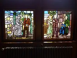 Im Innern beeindrucken die Verglasungen und die großformatigen Wandgemälde des alten Sitzungssaals. Die im Zweiten Weltkrieg zerstörten historistischen Glasmalereien wurden im Jahr 1951 durch das Saarbrücker Glasatelier Freese neu gestaltet. Das linke Fenster in der Arkade zeigt Paare in verschiedenen Lebensaltern: ganz links ein Mädchen mit Blumenstrauß und ein Junge, dann ein Brautpaar unter einer Lorbeergirlande. Daneben sieht man unter einem grünen Baum ein Paar mit Kleinkind auf dem Arm der Mutter, während der Mann seine Frau sanft streichelt. Rechts davon ist ein altes Ehepaar dargestellt: hinter einer sitzenden alte Frau im blauen Kleid, die zu stricken scheint, steht ein alter bärtiger Mann in grüner Bekleidung.