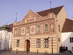 1933 wurde die dem Hauptplatz zugewandte Fassade und von August Hoffmann, einem Kunstmaler, mit Sgraffitomalereien versehen (restauriert 1982). Dargestellt werden unter anderem: