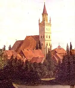 Ausschnitt aus Gemälde (1842) Mathilde von Lepel – rechts unter der Kirche das Fachwerkrathaus von 1650
