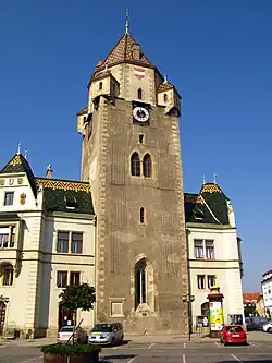 An der Stelle des heutigen Rathauses stand ursprünglich eine aus der Zeit um 1170 stammende Nikolauskirche, die 1193 konsekriert wurde und vermutlich zuletzt als Pfarrkirche der Stadt gedient hatte. In den Jahren 1440 bis 1447 wurde anstelle des Kirchturmes über der Apsis der Kirche der mächtige Stadtturm errichtet, der als Wachturm gegen Feinde und Feuergefahr dienen sollte. Im Hof des Rathauses ist noch der Triumphbogen dieser Kirche erkennbar. Der Turm wurde während des Dreißigjährigen Krieges schwer beschädigt als Graf Puchheim die Stadt für Österreich zurückgewann.