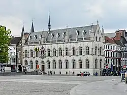 Das heutige Rathaus, dessen Kern sicherlich auf das Jahr 1418 zurückgeht, wurde um 1520 im Übergangsstil zwischen Gotik und Renaissance erbaut und erheblich vergrößert. Die Fassade wurde vergoldet und mit Polychromie verziert (wie das heutige Brüsseler Rathaus). Die Prophetenstatuen in den Nischen wurden 1526 durch die Statuen der bedeutendsten Grafen von Flandern ersetzt. Der 1616 hinzugefügte Teil der Fassade ist im gleichen Stil gehalten. Ab dem Ende des 17. Jahrhunderts und während des gesamten 18. Jahrhunderts erfuhr die Fassade zahlreiche Veränderungen und sogar Verstümmelungen. So wurde beispielsweise der Pranger von Kortrijk an der Fassade des Rathauses aufgestellt. Im Jahr 1807, während der Französischen Revolution, wurden die Statuen und Baldachine entfernt und die gesamte Fassade im Sinne des Zeitgeistes neu gestaltet. Um 1850 wurde die Fassade unsachgemäß restauriert. Die Haltbarkeit und der künstlerische Wert dieser Restaurierung wurden bereits während der Ausführung der Arbeiten in Frage gestellt. Die Statuen der zwölf flämischen Gräber wurden 1872 wieder in die Nischen gestellt. Der Schöffensaal wurde 1875 restauriert und von König Leopold II. und Königin Maria-Hendrika eingeweiht. Im Jahr 1934 wurde der historische Ratssaal restauriert.