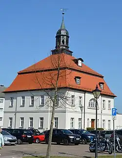 Bereits im Jahr 1609 wurde ein Rathaus mit Ratssaal erwähnt, das jedoch 1660 niederbrannte.[1] Der Bau des heutigen Rathauses erfolgte im Jahr 1747 auf quadratischem Grundriss. Die schlichten, verputzten Fassaden sind fünfachsig ausgebildet. Bedeckt wird das Rathaus von einem Mansardwalmdach, das von einer achteckigen, verschieferten Laterne bekrönt wird, die ihrerseits eine geschweifte Haube trägt. Im Jahr 1827 erfolgte eine Erneuerung des Gebäudes.