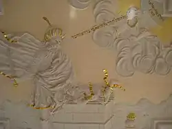 Die in lichte Farben gefasste Decke des Sitzungssaals ist reichhaltig mit Ornamenten, Bildmotiven und hebräischen Schriftzügen geschmückt. Der Schriftzug in Sternform über der Eingangstür enthält einen Lobpreis der Tora und die Bitte um Erlösung aus der Diaspora. Im Saal und den Nebenräumen werden in Medaillons Szenen aus dem Alten Testament dargestellt: Jakobs Segen, Opferung Isaaks, Jakob mit der Himmelsleiter, König David und Moses.