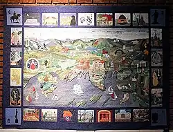 - Im Zugangsbereich zum Rathaus erhielt ein gestickter Wandteppich seinen Platz, den 18 namhafte Osloer Künstler aus Anlass des 1000. Stadtjubiläums (im Jahr 2000) gefertigt hatten. Er zeigt in der Mitte einen dreidimensionalen Stadtplanausschnitt des Zentrums. In einem breiten ebenfalls gestickten Rahmen sind Einzelbauwerke oder grafische Symbole in kleinen rechteckigen Feldern eingearbeitet. Die vier Eckbilder als Silhouetten auf hellblauem Grund beziehen sich auf Oslos Geschichte. Das Besondere: die Künstler haben das Objekt dreidimensional gefertigt, damit es auch Blinde nutzen können.[8]