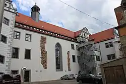 Der Bau wurde offenbar von Andreas Bretschneider konzipiert. Valten Wegern errichtete zunächst nur die nördlichen drei Viertel des Baukörpers, verputzte sie grob und färbte sie ocker ab. Der erste Bauabschnitt endete also am südlichen Durchgang, an dem 1972 ein gotisches Portal freigelegt wurde, welches nun als Eingang zum Ratscafé dient. Das südliche Querhaus wurde erst 1577/78 angebaut. Markant an diesem Bau ist sein Eckerker. Vorbild für diesen Erker war der von Andreas Buschwitz um 1536 am Schloss Hartenfels erbaute Außenerker.