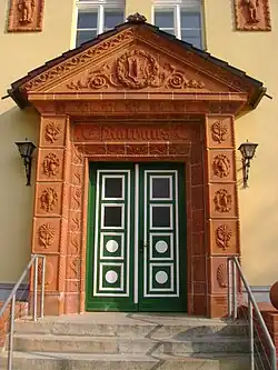 Das 1922 aus einem ehemaligen Elektrizitätswerk umgebaute Veltener Rathaus. Der Terrakottaschmuck am Hauptportal und über den Fenstern wurde von der Richard Blumenfeld Veltener Ofenfabrik AG gebrannt.