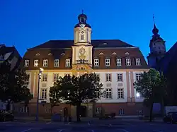 Beim Gebäude unter der Adresse Markt 1 in Weißenfels handelt es sich um das Rathaus der Stadt und ist der zweite Neuaufbau des Gebäudes. Bei einem Stadtbrand im Jahr 1663 brannte das ursprüngliche Rathaus bis auf die Grundmauern nieder. Es erfolgte ein Wiederaufbau des Gebäudes. Der Baumeister Christian Richter errichtete dort 1690 den Rathausturm mit einer Turmuhr neu. Bei einem weiteren Stadtbrand im Jahr 1715 wurde der Bau erneut beschädigt. Diesmal traf es nur die oberen Stockwerke. Der Baumeister Johann Christoph Schütze baute es 1718/22 im Barockstil wieder auf. Dabei wurden die noch erhalten gebliebenen Teile des Vorgängerbaus in den Neubau mit einbezogen. Nach der Fertigstellung diente das Gebäude wieder als Verwaltungssitz der Stadt Weißenfels. Der Baumeister für den zweiten Neuaufbau war Christoph Schütze. Aufgrund statischer Probleme, die im Jahr 2012 festgestellt wurden, wird das Gebäude nicht von der Verwaltung genutzt. Über das Stark V Investitionsförderprogramm erhielt die Stadt Weißenfels zwei Millionen Euro vom Bund und vom Land zur Sanierung des Gebäudes. 90 % der Fördersumme kommen vom Bund und die restlichen 10 % vom Land Sachsen-Anhalt.[2] Nach der Sanierung des Gebäudes ist eine erneute Nutzung durch die Stadtverwaltung vorgesehen.