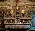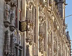 Auf den Mauerkronen befinden sich Skulpturen historischer Figuren unter verzierten Baldachinen, die mehrmals erneuert wurden und zum skulpturalen Konzept von Jan van Valenciennes gehörten. Vor allem während der Französischen Revolution wurden viele originale Skulpturen zerstört. Einige authentische Teile dieser Skulpturen befinden sich in der Sammlung der Brügger Museen. Die zinnenbewehrte Brüstung ist mit Erkertürmen verziert. Das Satteldach wurde um einen Firstkamm ergänzt und erhielt viele Dachgauben. 1766 wurde der linke Eingang symmetrisch gegenüber dem rechten Eingang angebracht. Ursprünglich befand er sich in der ersten Travée.
