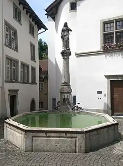 Der achteckige Spätrenaissancebrunnen auf dem Rathausplatz vor dem Rathaus in der Altstadt von Brugg entstand zwischen 1557 und 1563. Der Brunnen hat einen exzentrischen Brunnenstock auf viereckigem Sockel und runder Trommel, die Statue von Justitia des Schweizer Bildhauers Eduard Spörri aus Wettingen schmückt eine Balustersäule mit Kompositkapitell.