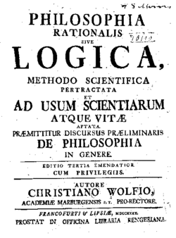 - ↑ Christian Wolff: Philosophia rationalis sive logica. 3. Auflage. Prostat in Officina libraria Rengeriana, Frankfurt und Leipzig 1740, S. §58, 29 f. (eingeschränkte Vorschau in der Google-Buchsuche).}