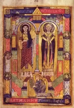 Das Ratmann-Sakramentar ist eine illuminierte liturgische Handschrift, die 1159 von einem Mönchspriester namens Ratmann geschrieben und für den Hochaltar des Klosters von St. Michael in Hildesheim gestiftet wurde. Möglicherweise handelt es sich um denselben Ratmann, der in einer Urkunde von 1178 als Abt des Klosters erscheint. Das Sakramentar enthält reichen Buchschmuck, darunter die Miniatur, die Bischof Bernward von Hildesheim, den Stifter des Klosters, bereits vor seiner Kanonisation von 1192 neben dem Erzengel Michael (als dem Kirchenpatron) zeigt. Im Jahr 1150 hatte eine Provinzialsynode in Erfurt die lokale Verehrung Bernwards in St. Michael gestattet.[1]