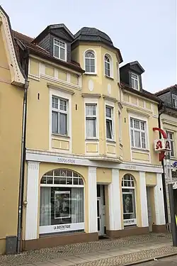 Das zweigeschossige verputzte Gebäude entstand nach einer am Haus befindlichen Inschrift im Jahr 1912. Gestalterisch finden sich Elemente des Klassizismus und des Jugendstils. Markant ist ein vor dem Ober- und Dachgeschoss befindlicher polygonaler Erker. Insbesondere die Ladenfront im Erdgeschoss ist mit Verzierungen versehen.