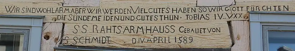 Die Farbgebung der Fassade wurde nach historischem Befund der Farbschläge ermittelt und rekonstruiert.[5] Im Rahmen der Bauarbeiten, wurde durch dendrochronologisch Untersuchungen festgestellt, dass das Gebäude nicht 1589, sondern erst um 1730 errichtet wurde. Der Seitenflügel des Hauses, der an der 4. Wallstraße liegt, wurde um 1720 errichtet. Das Haupthaus, ein zweigeschossiges Fachwerkhaus mit Dachgaube am Krüppelwalmdach und den Ausfachungen aus Backsteinen in der Kirchenstraße 2, wurde erst 1736 errichtet. Um die Dachhöhen anzupassen, ist das Dach des Anbaus dem Hauptgebäude angepasst worden. 1790 wurden mittels Türdurchbrüche die Gebäude verbunden. Bei dem Balken über der Eingangstür des Haupthauses handele es sich um eine Spolie. Das Wiederverwenden von altem Material wird im Dachstuhl des Anbaus des Ratsarmenhauses deutlich, dort wurde ein Sparren aus Eiche auf das Jahr 1449 datiert.[6]