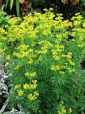 • Weinraute oder Duftende Raute (Ruta graveolens L.)[3] (Synonyme: Ruta divaricata Ten. und Ruta hortensis Mill.)[5]