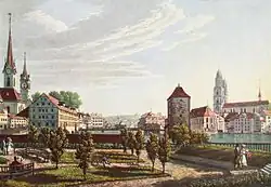 - ↑ Die Kunsthandlung Hans Felix Leuthold gab 1846 den von Franz Schmid gezeichneten malerischen Plan der Stadt Zürich und ihrer Umgebungen heraus. Schmid (1796–1851) stammte aus Schwyz und gilt als einer der bedeutendsten Panoramenzeichner seiner Epoche.