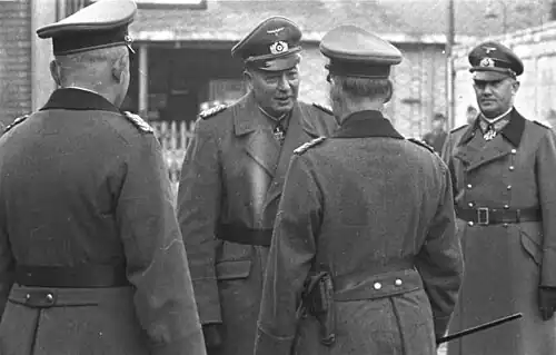 Links in Zivil Carl Oberg im Gespräch mit Standartenführer Griese, dahinter General Felber, der eine Meldung entgegennimmt -