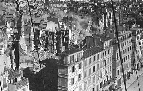 Im Rahmen der Operation Sultan sprengte das Pionierbataillon 328 der 328. Infanteriedivision das Altstadtquartier "Saint-Jean" (1. Arrondissement), das stark heruntergekommene gotische Patrizierviertel. Es erstreckte sich über 700 Meter und die gesamte Länge der Nordseite des Vieux Port, nach Norden hin auf eine Tiefe von 180 Meter. Vom 1. bis zum 17. Februar wurden 1.494 Gebäude zerstört, ausgenommen wurden das Hôtel de Ville von 1653, die romanische Kirche Saint-Laurent, die Zollgebäude und die Consigne Sanitaire von 1719, das Hôtel de Cabre von 1535 und die rennaissacezeitliche Maison Diamantée. Für eine derart radikale Maßnahme gab es zwar französische Vorkriegsplanungen, aber in Wirklichkeit "standen die Sicherheit der Truppe und die Seuchengefahr im Vordergrund",[19] wie es sich auch aus dem Befehl Heinrich Himmlers vom 18. Januar ergibt.