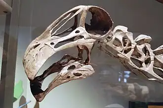 Wenn man den Unterkiefer von oben betrachtet, erscheint er L-förmig und bildet ein sehr breites, kastenförmiges Gebiss, das gerade Zahnreihen enthält, die quer zum Längsschaft des Unterkiefers stehen – ein unter Dinosauriern einzigartiges Merkmal. Die Gesamtlänge des Unterkiefers wird von der Breite der Schnauze leicht übertroffen.[6][4]