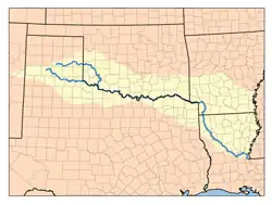 ![]() Red River (blau) und sein Einzugsgebiet (gelb). Die Karte enthält einen kleinen Fehler: In Arkansas und im Norden Louisianas erstreckt sich das Einzugsgebiet nicht ganz bis zum Mississippi. | ||