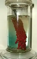 Wird ein Eisennagel in eine wässrige Kupfer(II)-sulfatlösung gestellt, bildet sich ein rotbrauner Belag von metallischem Kupfer auf dem Nagel. Das Kupfer wird dabei reduziert, das Eisen zu Fe2+-Ionen oxidiert.