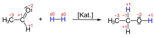Häufiger wird im Zusammenhang mit sauerstoffhaltigen, organischen Verbindungen von Reduktion gesprochen, wie beispielsweise der Umsetzung von Ketonen oder Aldehyden zu Alkoholen. Nimmt Acetaldehyd Wasserstoff auf, so entsteht Ethanol. Dabei ändert sich die Oxidationsstufe der Carbonylgruppe von +1 nach −1: