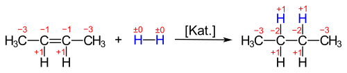 Eine Aufnahme von Wasserstoff durch organische Verbindungen führt zu einer Verringerung der Oxidationszahl eines oder mehrerer Kohlenstoffatome.[5] Die katalytische Hydrierung von 2-Buten führt zu Butan: