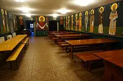 In orthodoxen Klöstern wird die Trapesa, der Essraum (griechisch τράπεζα, russisch трапеза[1]), als Gegenpol zum Katholikón, dem Gebetsraum, betrachtet. Idealerweise drückt sich das auch in der Architektur aus, indem beide Gebäude auf einer Achse liegen. Vom erhöhten Platz des Abtes in der Trapesa kann dieser bei geöffneten Türen bis zur Königstür der Ikonostase im Katholikon blicken.[2] Die Wände der Trapesa sind bemalt, was den Raum kirchenartig wirken lässt. Die Tische der Mönche haben traditionell die Gestalt des griechischen Buchstabens Sigma (bzw. eines Halbkreises), mit der Rundung zur Wand und der geraden Seite zum Mittelgang, sodass sie für die Tischdiener gut erreichbar sind.[3] Um den Tisch zieht sich eine entsprechend gebogene Bank. Die Tischplatte kann eine umlaufende Rinne haben, die der einfachen Reinigung dient.